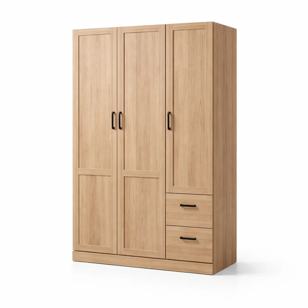 Armadio a tre ante in legno MDF con due cassetti rovere chiaro