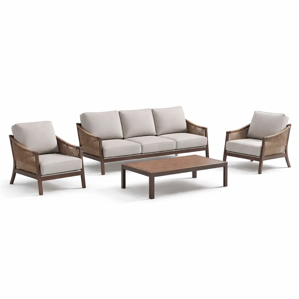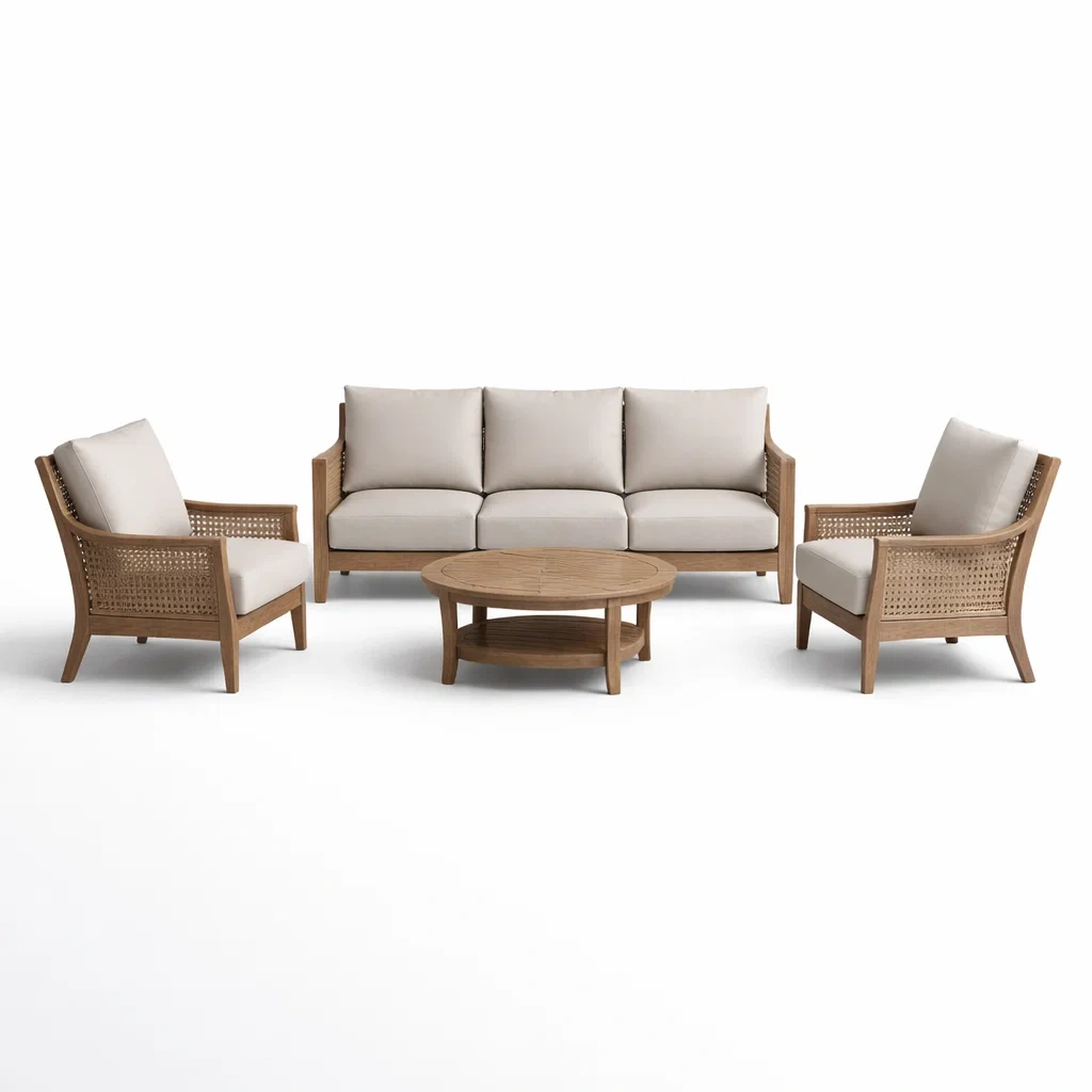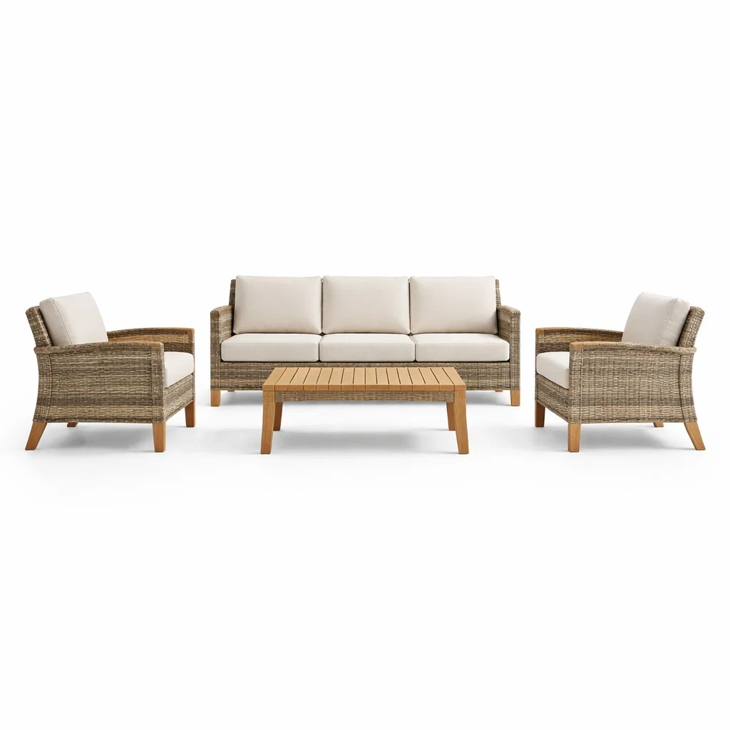 Set di divani da esterno in legno e rattan con cuscini beige e tavolino