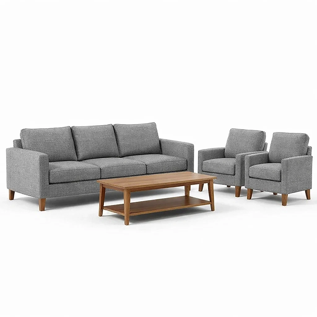 Set di divani in tessuto poliestere grigio con tavolino e poltrone