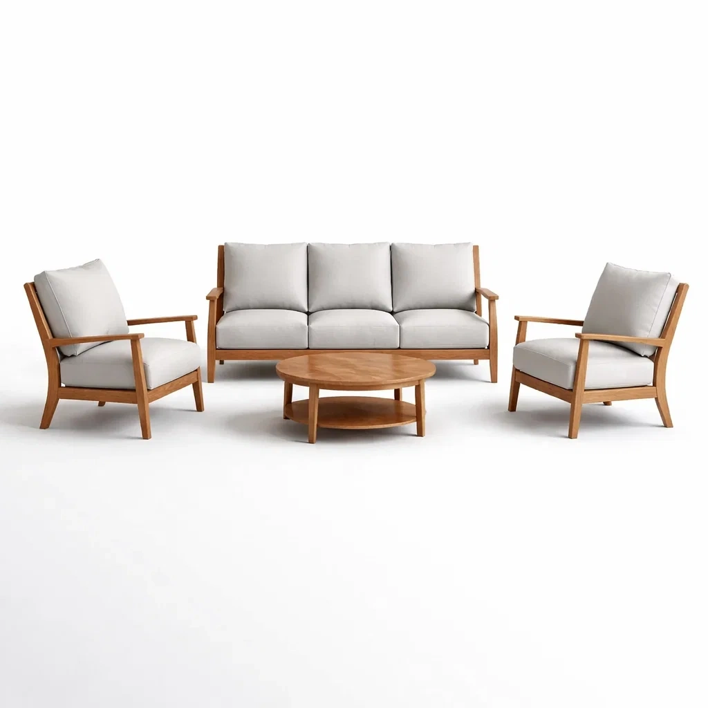 Set di divani e poltrone in legno e tessuto grigio chiaro con tavolino rettangolare