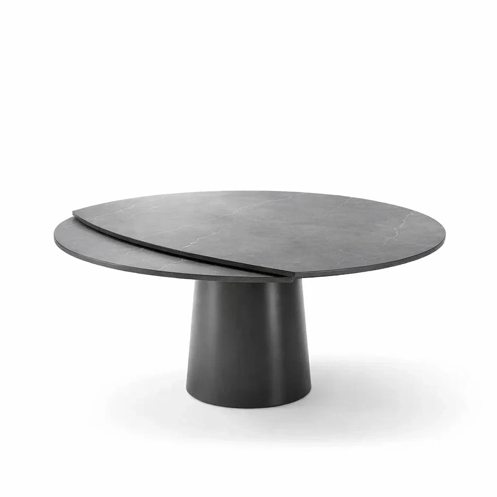 Tavolo da pranzo rotondo in pietra grigia con base in acciaio