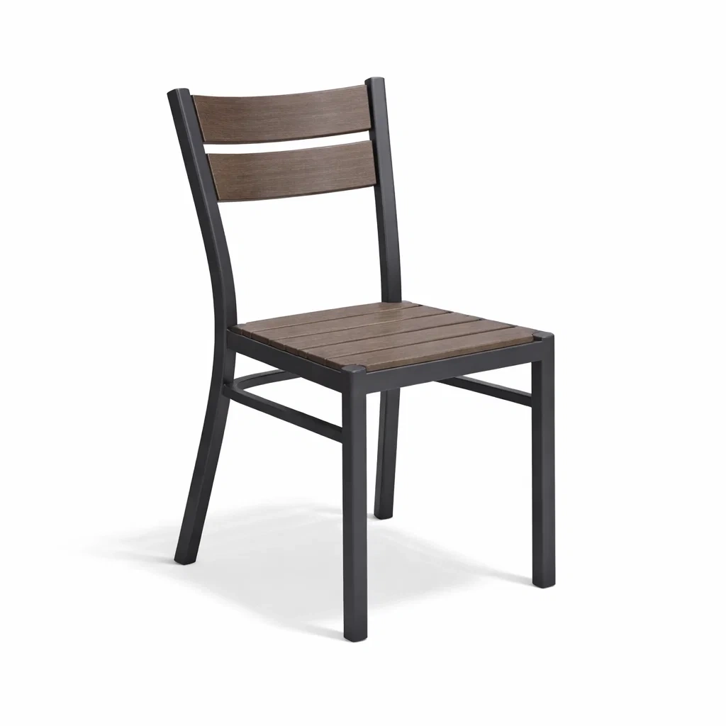 Questa sedia presenta una struttura in alluminio verniciato nero e una seduta e schienale in legno composito marrone. Resistente all'acqua e adatta per uso esterno. Dimensioni: altezza 85 cm, larghezza 45 cm, profondità 50 cm. Peso: 4.5 kg. Capacità di carico: 120 kg. La sedia non è impilabile e non richiede assemblaggio. Si consiglia di pulire con un panno umido.