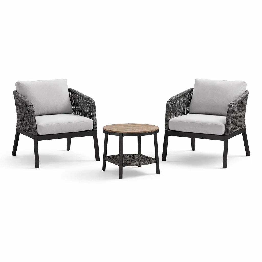 Materiali: Rattan sintetico, struttura in alluminio, piano del tavolo in legno di acacia.