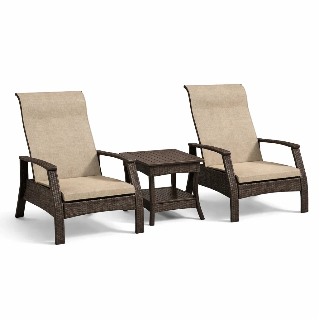 Set di mobili da giardino composto da due poltrone e un tavolino in rattan sintetico. Le poltrone possiedono imbottiture in schiuma ad alta densità e sono rivestite in tessuto di poliestere. Il colore è Marrone e Beige.