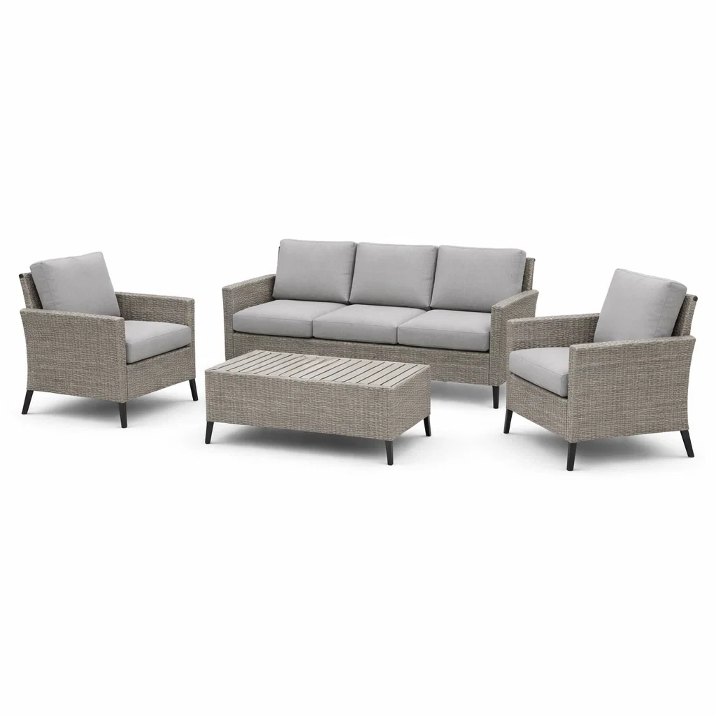 Materiali: Struttura in rattan sintetico, cuscini con rivestimento in tessuto poliestere e imbottitura in schiuma, gambe in metallo.