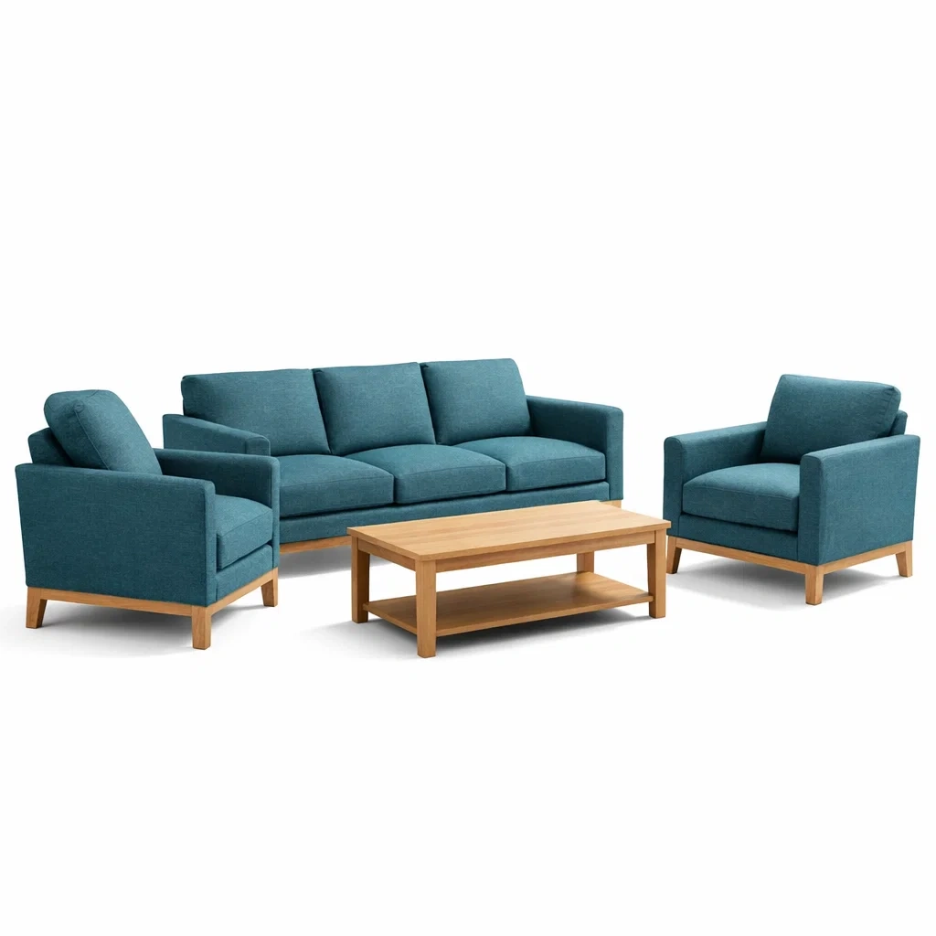 Dimensioni: Divano (lunghezza 200 cm, larghezza 80 cm, altezza 85 cm), Poltrona (lunghezza 90 cm, larghezza 80 cm, altezza 85 cm), Tavolino (lunghezza 100 cm, larghezza 50 cm, altezza 40 cm)