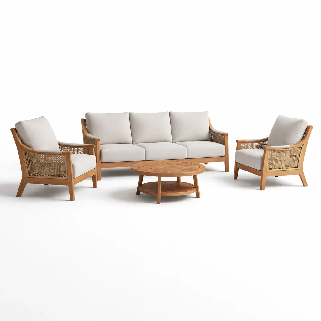 Materiale: legno massello, rattan, tessuto poliestere, imbottitura in gommapiuma