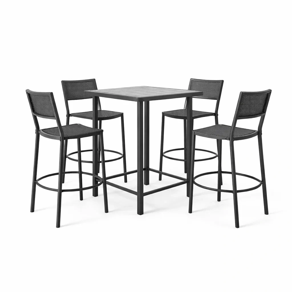 Set composto da un tavolo alto e quattro sgabelli in metallo verniciato a polvere. La struttura è resistente agli agenti atmosferici. Il tavolo misura 70x70x105 cm e ogni sgabello 40x40x105 cm, supportando fino a 150 kg ciascuno. Facile da pulire con un panno umido evitando detergenti abrasivi.