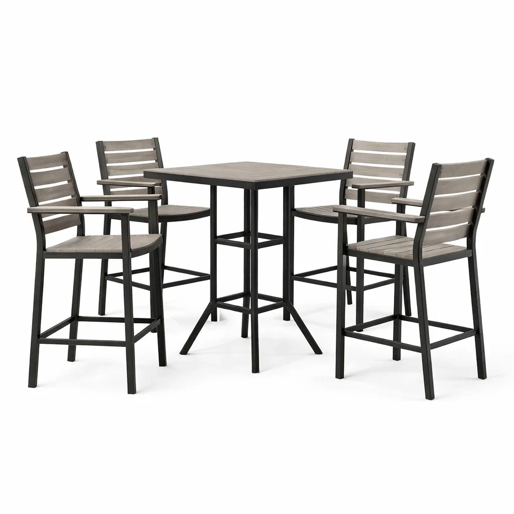Il set comprende un tavolo alto e quattro sedie. La struttura è in metallo, mentre il piano del tavolo e le sedute delle sedie sono in legno riciclato grigio.