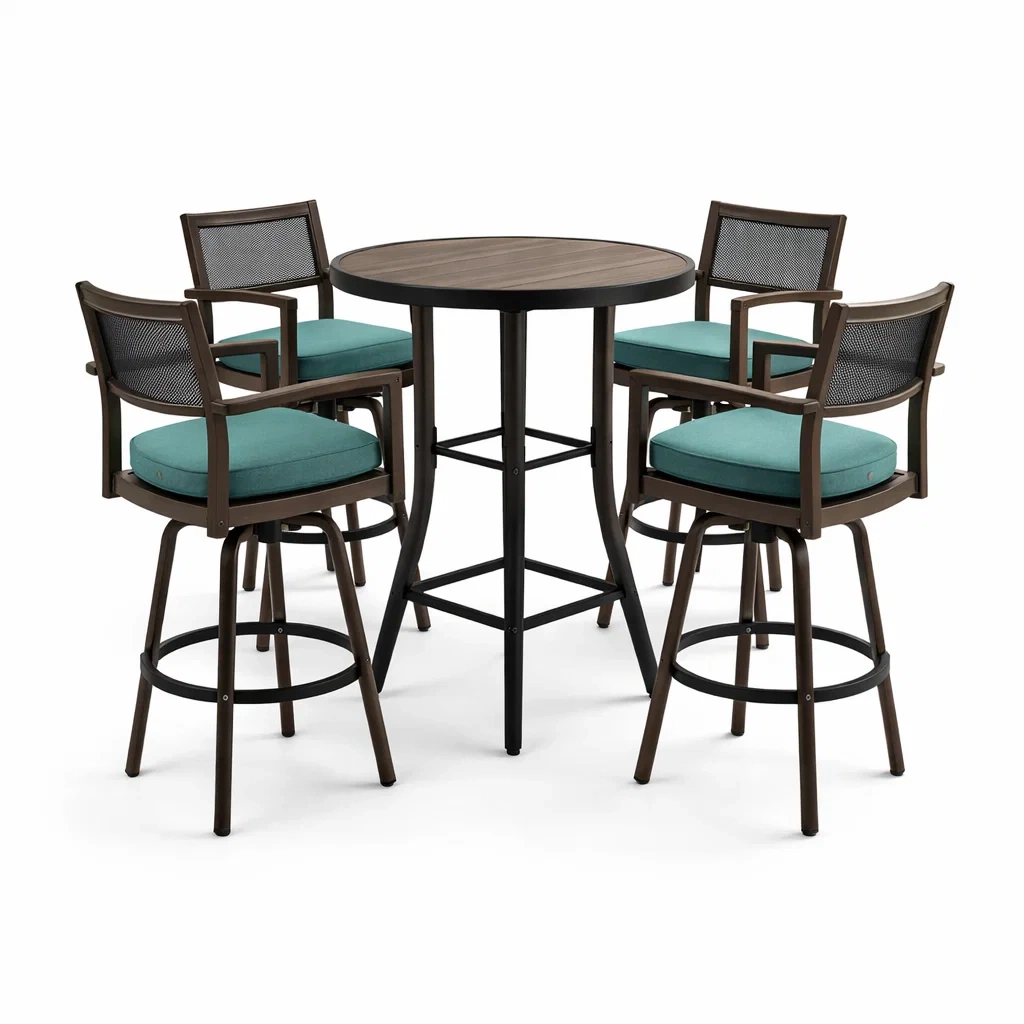 Set composto da un tavolo rotondo alto in legno con struttura in metallo e quattro sedie abbinate. Le sedie dispongono di braccioli, schienale in rete e cuscini in schiuma rivestiti in poliestere verde. Il tavolo ha un'altezza di 102 cm e un diametro di 76 cm, mentre le sedie misurano 118 cm in altezza. Resistenza agli agenti atmosferici per uso interno ed esterno. Pulire con un panno umido.