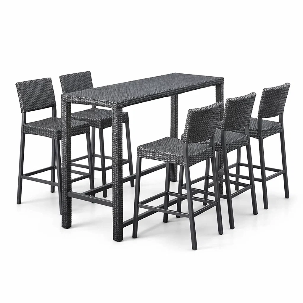 Il set comprende un tavolo e quattro sgabelli con struttura in metallo e rivestimento in polyrattan intrecciato. Il tavolo misura 110 cm in altezza, 120 cm in larghezza e 60 cm in profondità. Gli sgabelli hanno un'altezza di 75 cm. Il design è resistente all'acqua e antiruggine, adatto per ambienti interni ed esterni. Pulizia consigliata con panno umido.
