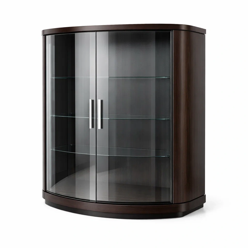 La struttura principale è realizzata in legno massello, mentre le mensole sono in vetro temperato da 6 mm. Le maniglie sono in acciaio inox.